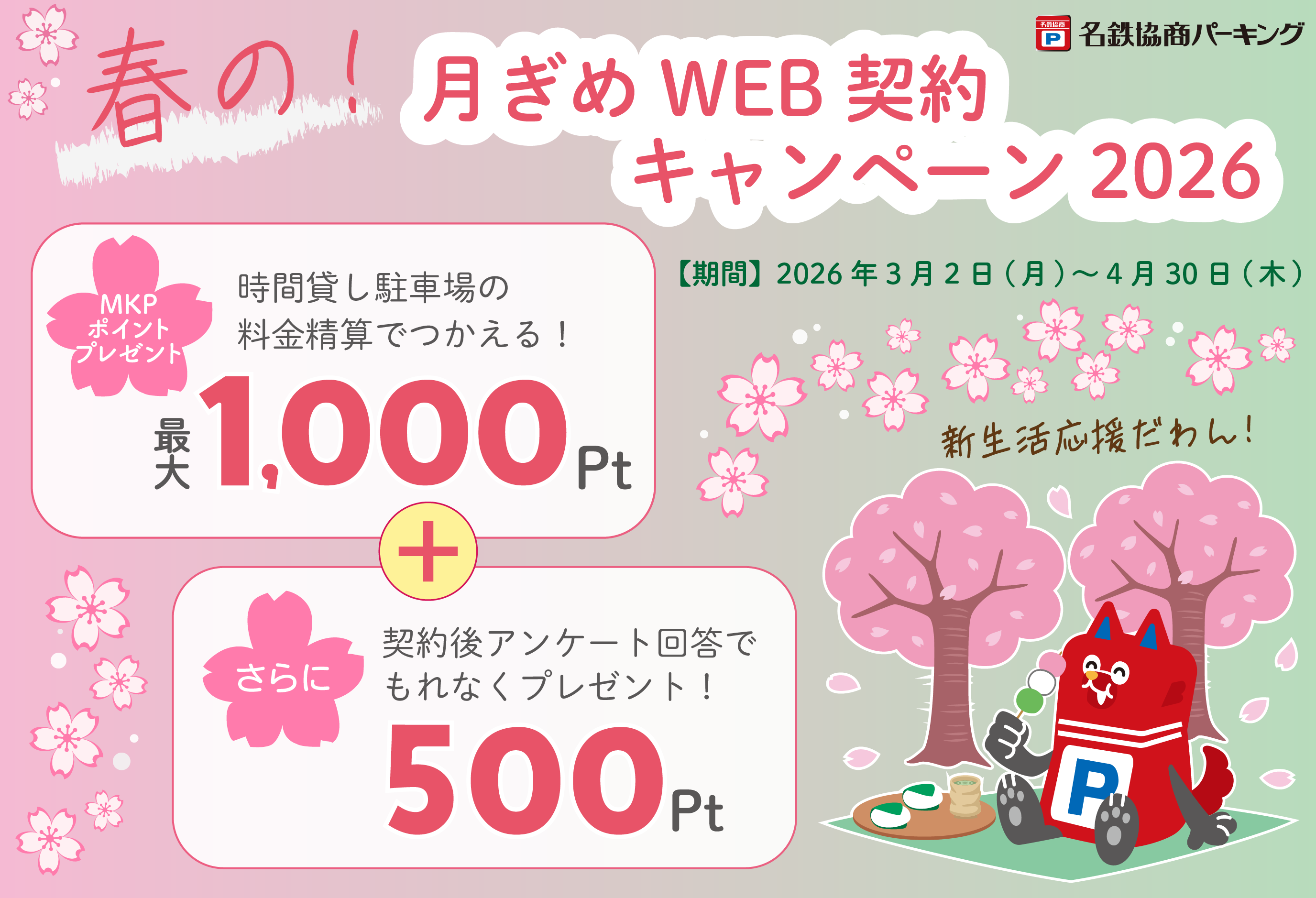 ・WEB契約にて月ぎめ駐車場をご契約いただいた方には、もれなくMKPポイントカードが発行されます。(すでにポイントカードをお持ちの場合を除く)